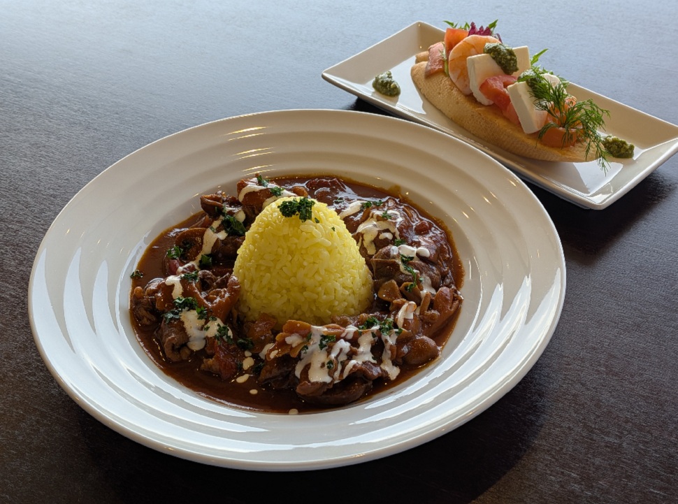柔らかい和牛の旨みと濃厚なサワークリームの酸味が調和した贅沢な洋食です。4種の具材を贅沢にのせたシーフードブルスケッタを添えて。スモークサーモンの薫香と海老の旨みを爽やかなジェノベーゼソースが引き立てます。