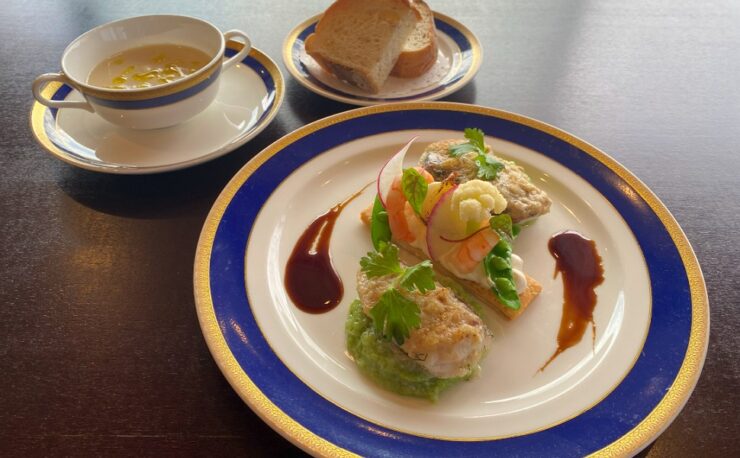 柔らかい和牛の旨みと濃厚なサワークリームの酸味が調和した贅沢な洋食です。4種の具材を贅沢にのせたシーフードブルスケッタを添えて。スモークサーモンの薫香と海老の旨みを爽やかなジェノベーゼソースが引き立てます。